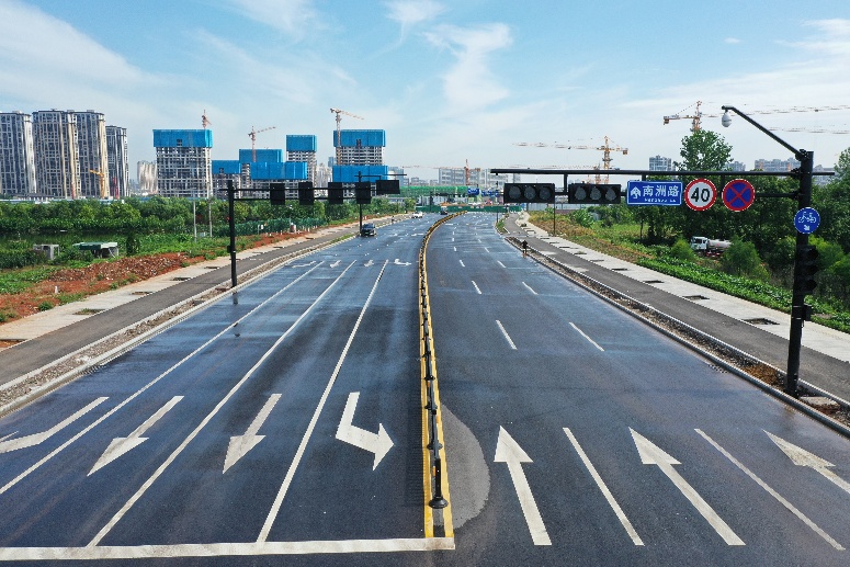 该项目合同造价5163万元,为城市次干道,设计速度40km/h;工程起于环城南路,起点桩号0+020,终点位于桩号1+060,主路全长1040m,宽36.0m;在号0+745.192处新建桥梁一座,桥长33m,宽38.35m;与南洲路临时衔接道路4处,共计316.55m等。