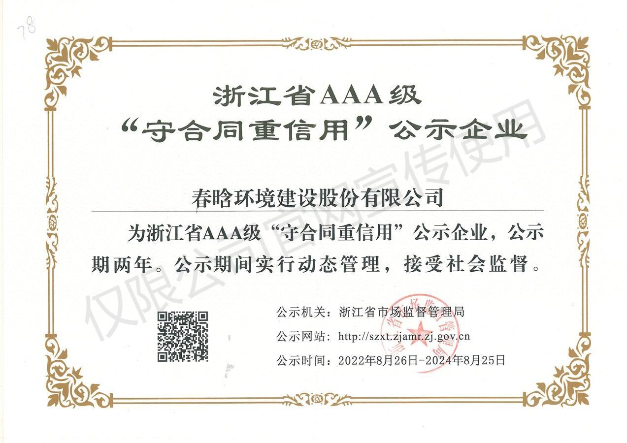 2022年浙江省AAA级“守合同重信用”企业(公示期两年)