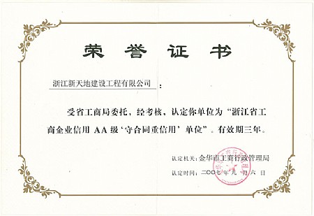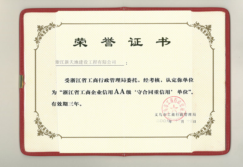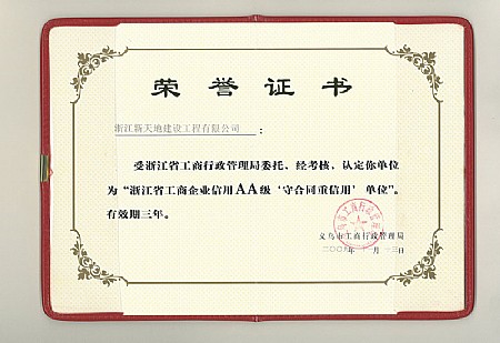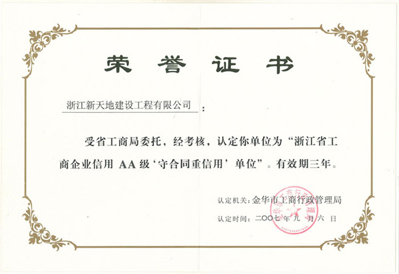 2007年浙江省工商企业信用AA级“守合同重信用”单位(有效期三年)