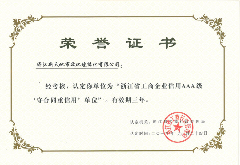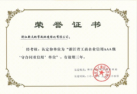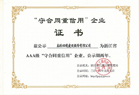 2013年浙江省工商企业信用AAA级“守合同重信用”单位(有效期三年)