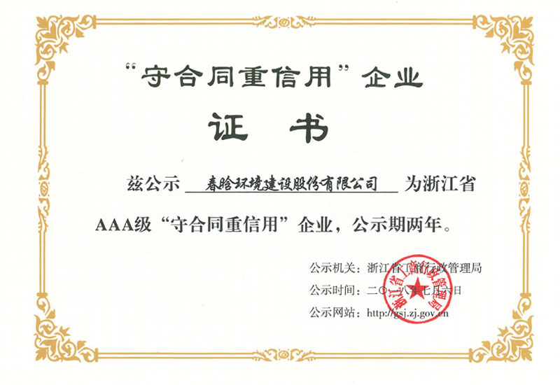 2018年浙江省AAA级“守合同重信用”企业(公示期两年)