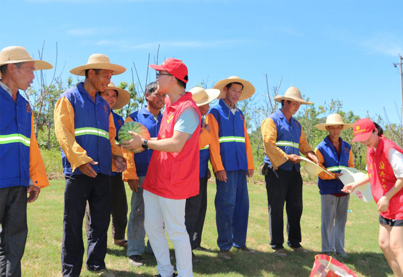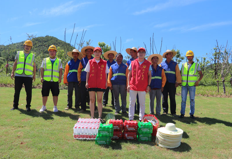 2019年7月23日至月底,春晗党支部协同公司工程部、工会人员到机场路三标、阳光大道二阶段三标、净居路改造工程、环城路-青岩刘绿化工程等在建项目一线,代表公司向奋战在一线的员工们送去了慰问,为坚持在高温天气工作的项目施工人员送去了矿泉水、西瓜、草帽、藿香正气水、仁丹等防暑降温用品,将公司的关怀和慰问及时传达给一线员工,让大家感受一丝舒心凉意。