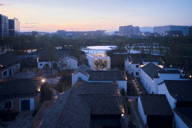 横塘公园位于城西街道望道信仰线的起点,紧临陆港电商小镇,公园布局方面,北部村落和展陈中心各占一边,南部是花田围合烘托着保留的会址纪念建筑,三者之间有树林相隔、水系相连,整体形成“北密南疏,西古东新”的景观格局。横塘公园分为“历史”“当代”和“未来”,是现代建筑与古建筑融合的艺术。